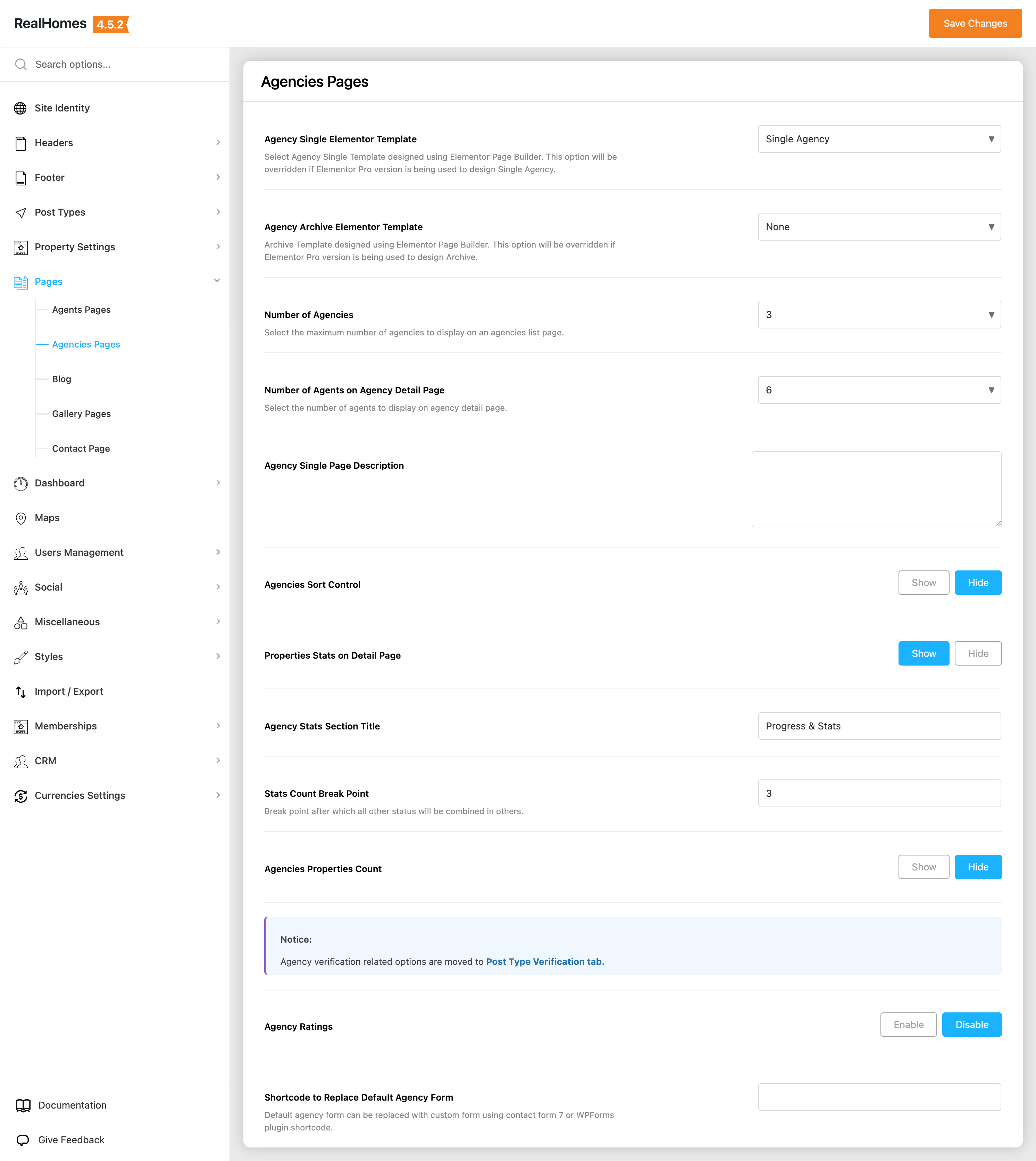 Dashboard ➤ RealHomes ➤ Settings ➤ Pages ➤ Agencies