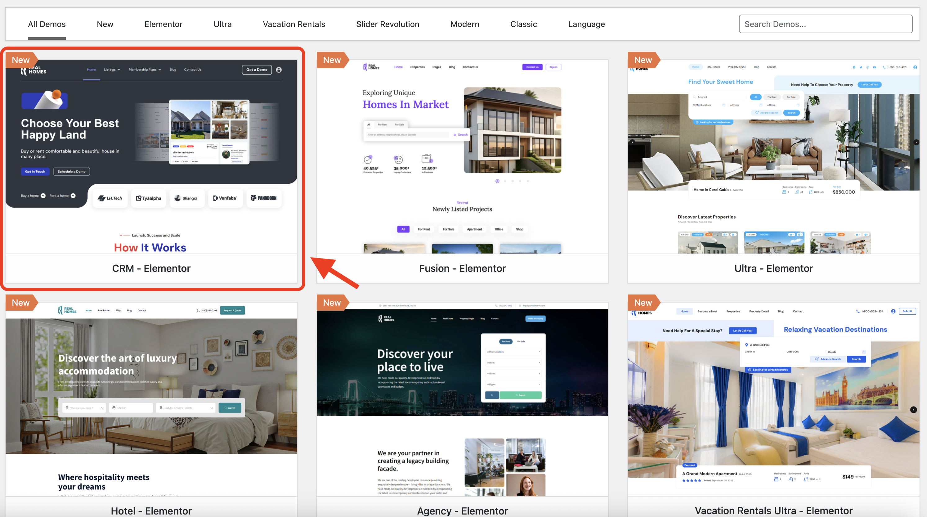 Click the blue Import Demo button under the CRM - Ultra Elementor option.