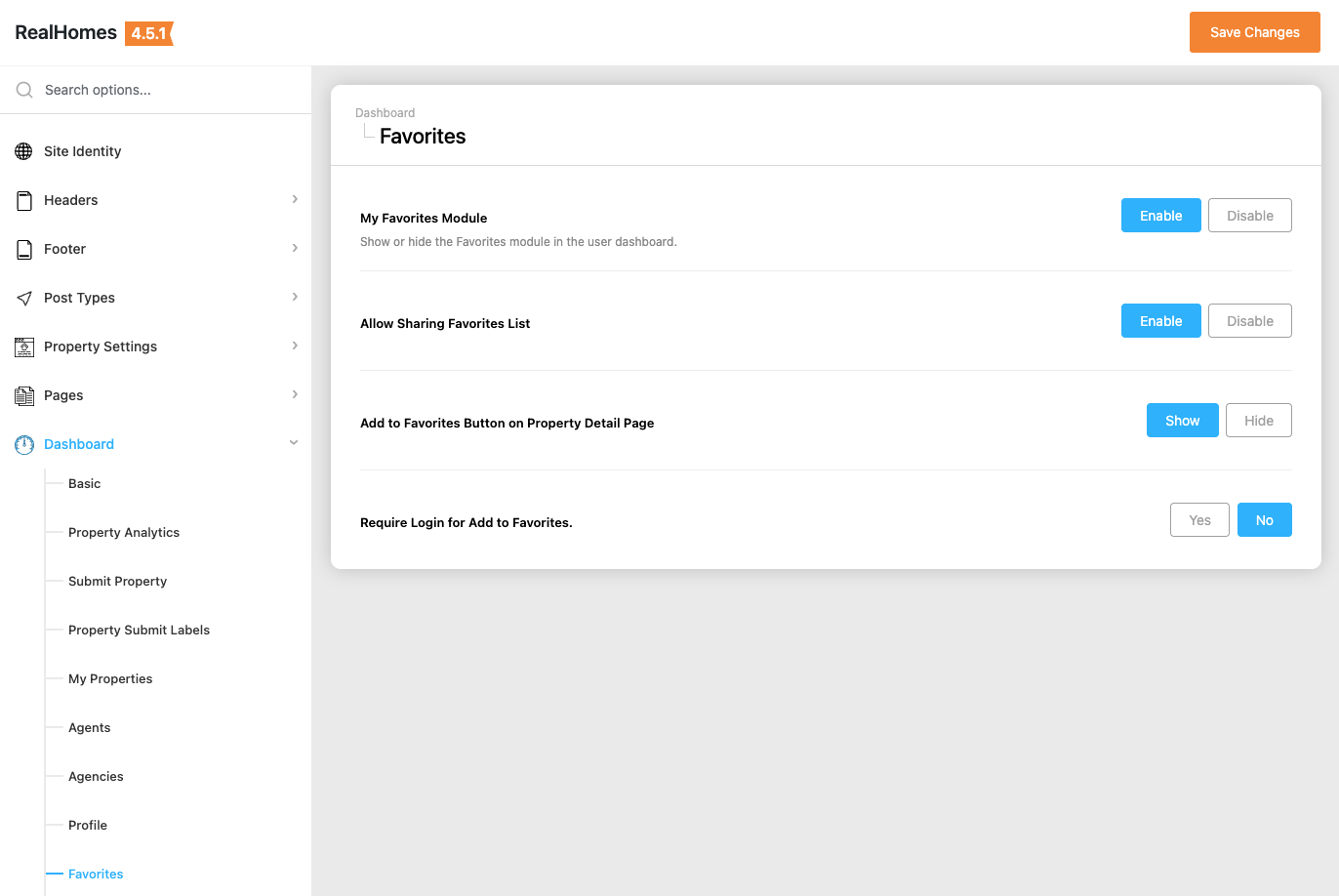 To enable/disable the favorites module, navigate based on your version of the RealHomes theme: