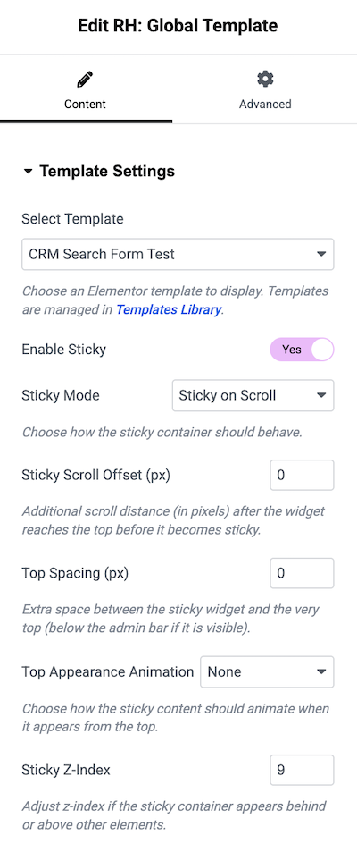 To use this widget, drag the RH: Global Template widget into your Elementor page. You will find the following configuration options under the Content → Template Settings tab.