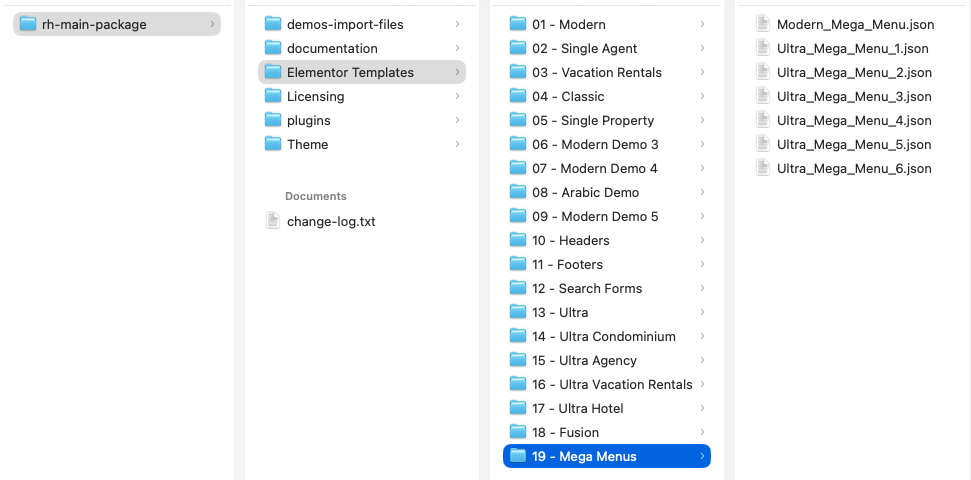 rh-main-package/Elementor Templates/19 - Mega Menus/folder to find the template JSON files.