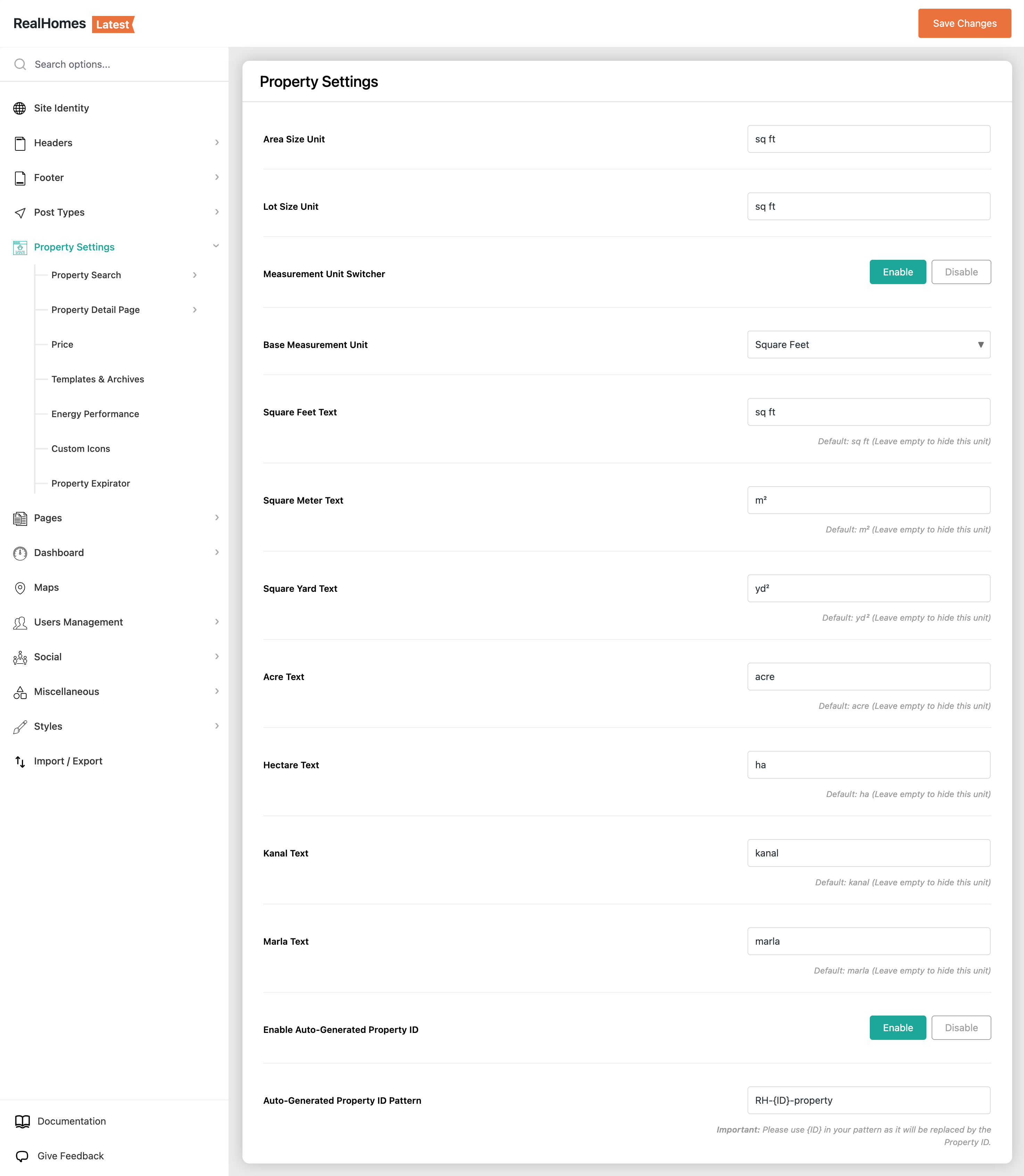sq ft,m²,acres, etc.). This unit will be used across all property listings for area fields. - Lot Size Unit: Define the unit for the lot size, which is separate from the area unit (e.g.,