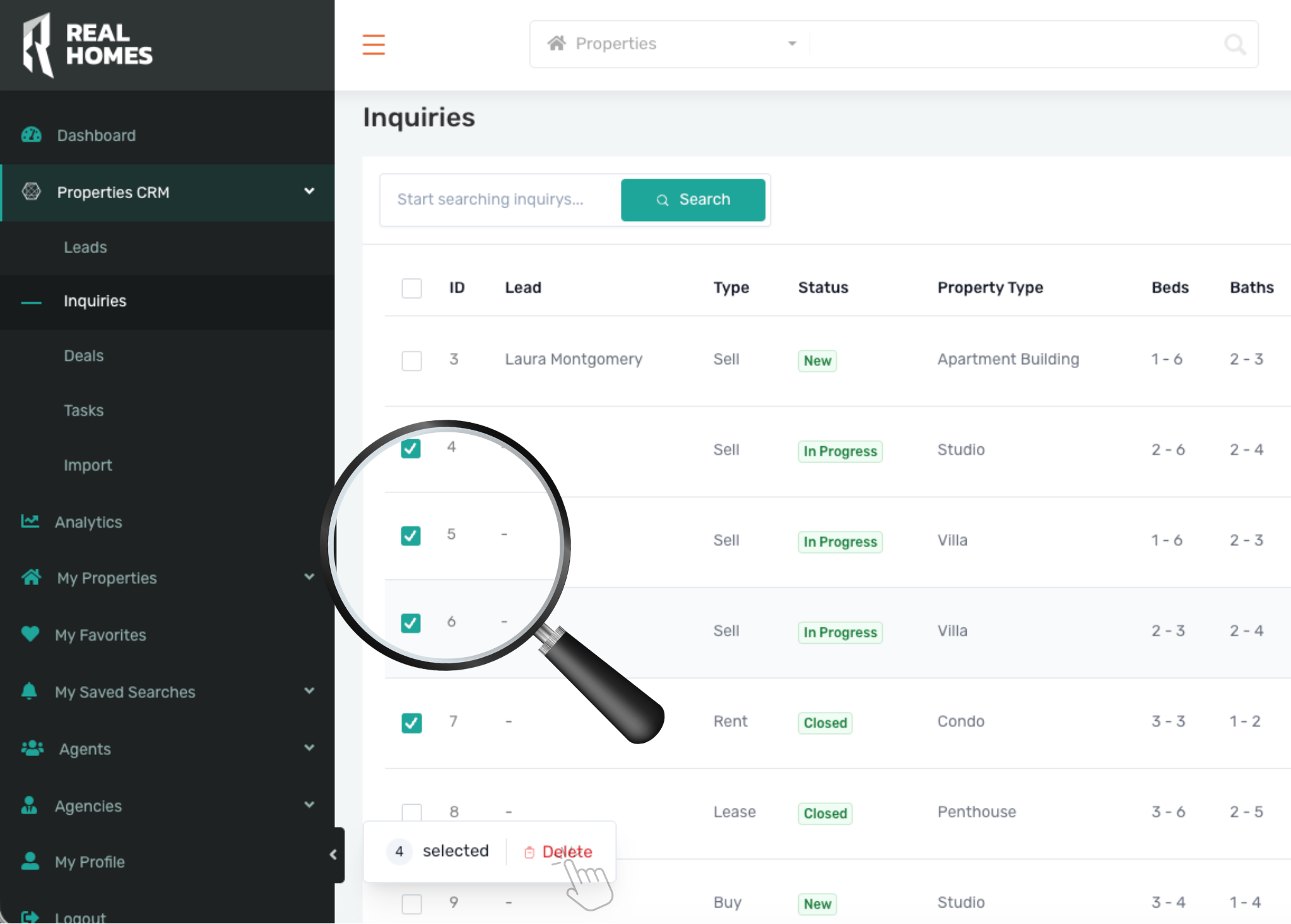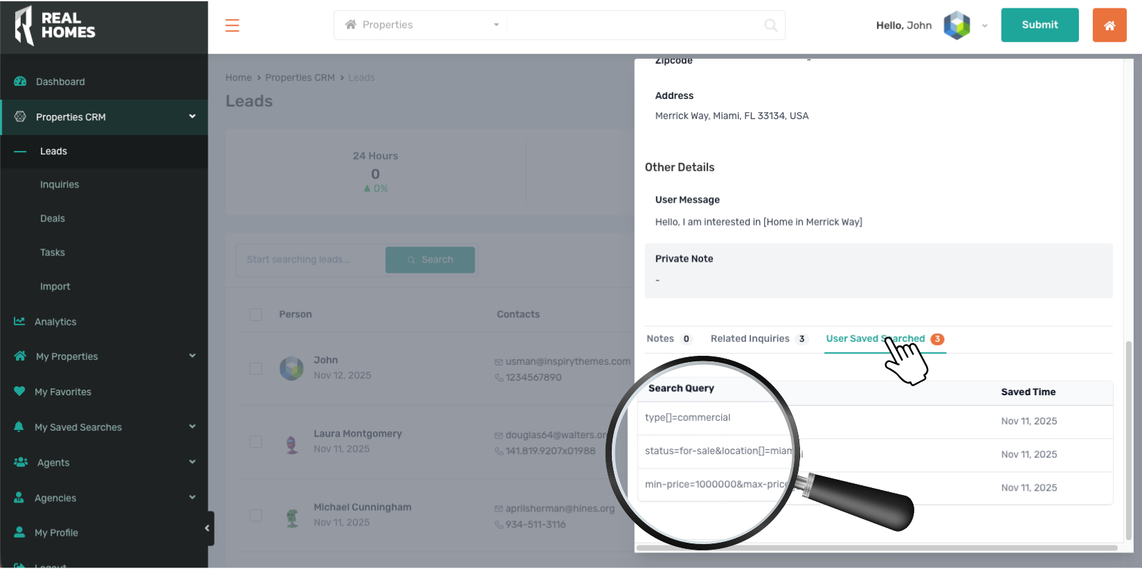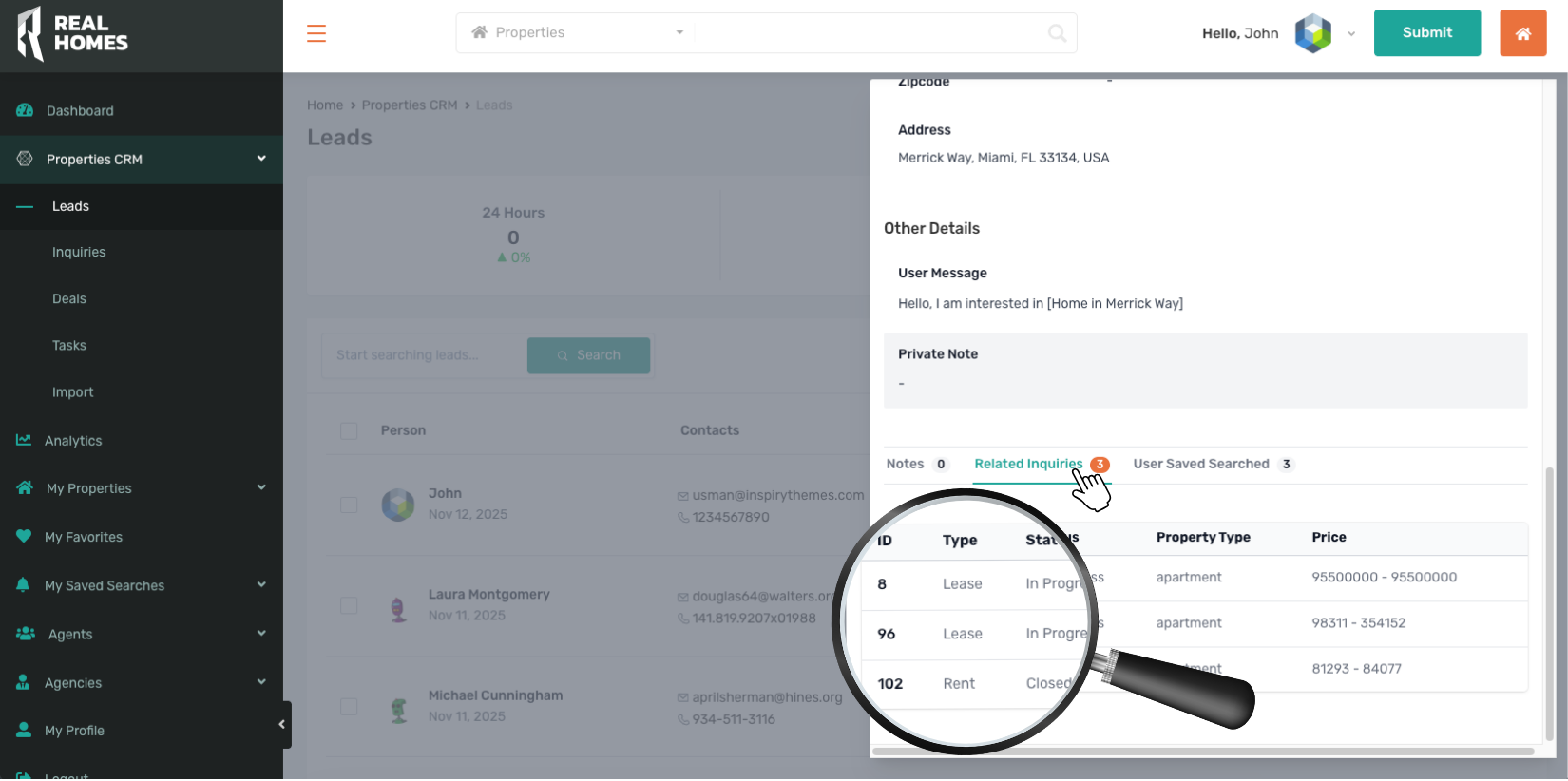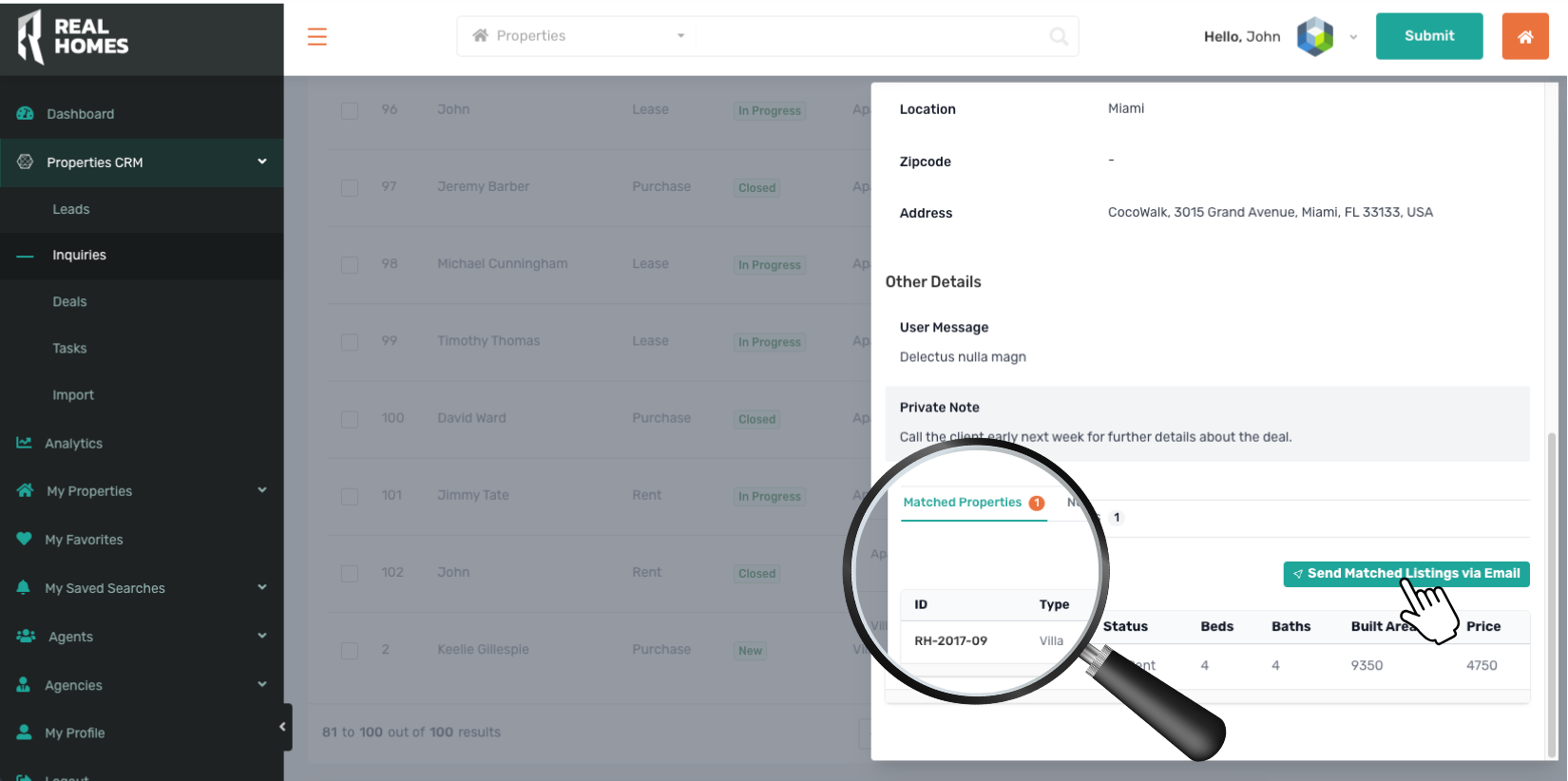 The RealHomes CRM automatically identifies properties that match a leadβs search criteria or inquiry details.