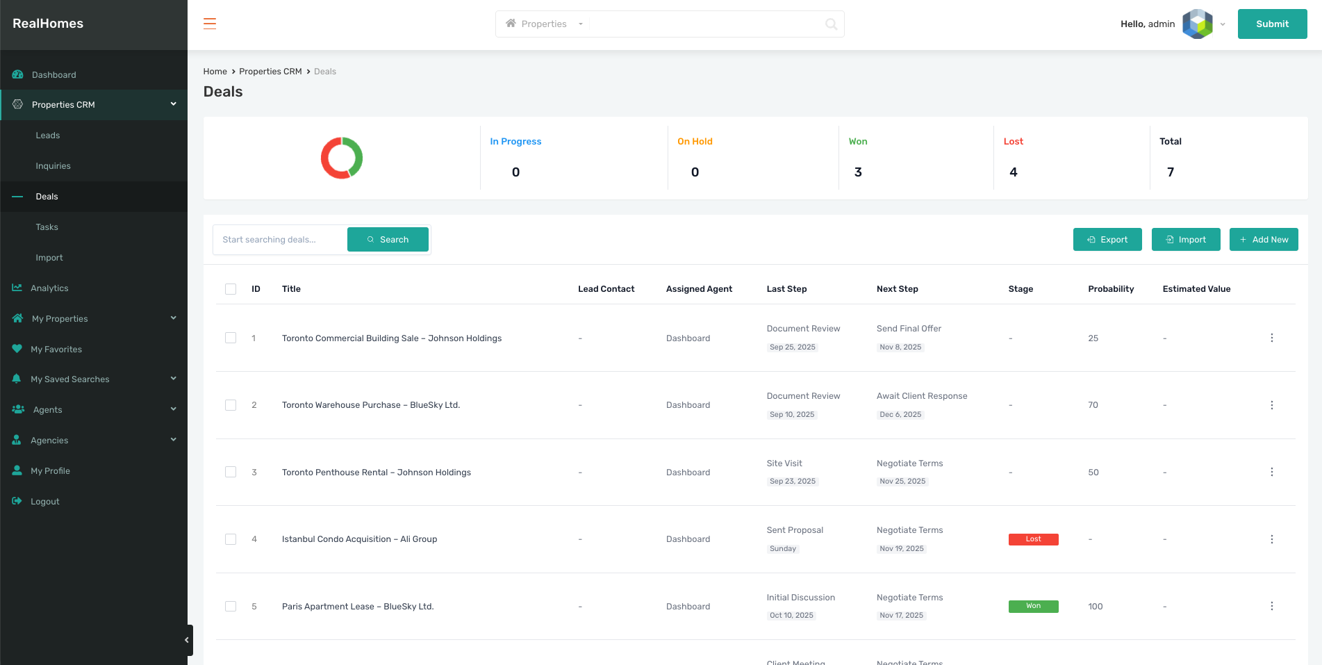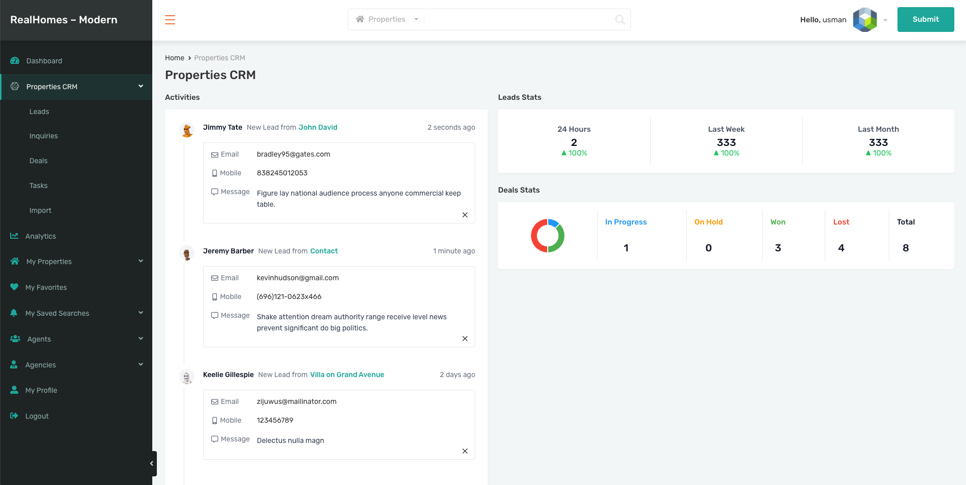 - Deals Stats: A summary of deals by status (In Progress, On Hold, Won, Lost, Total).