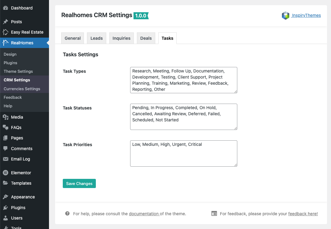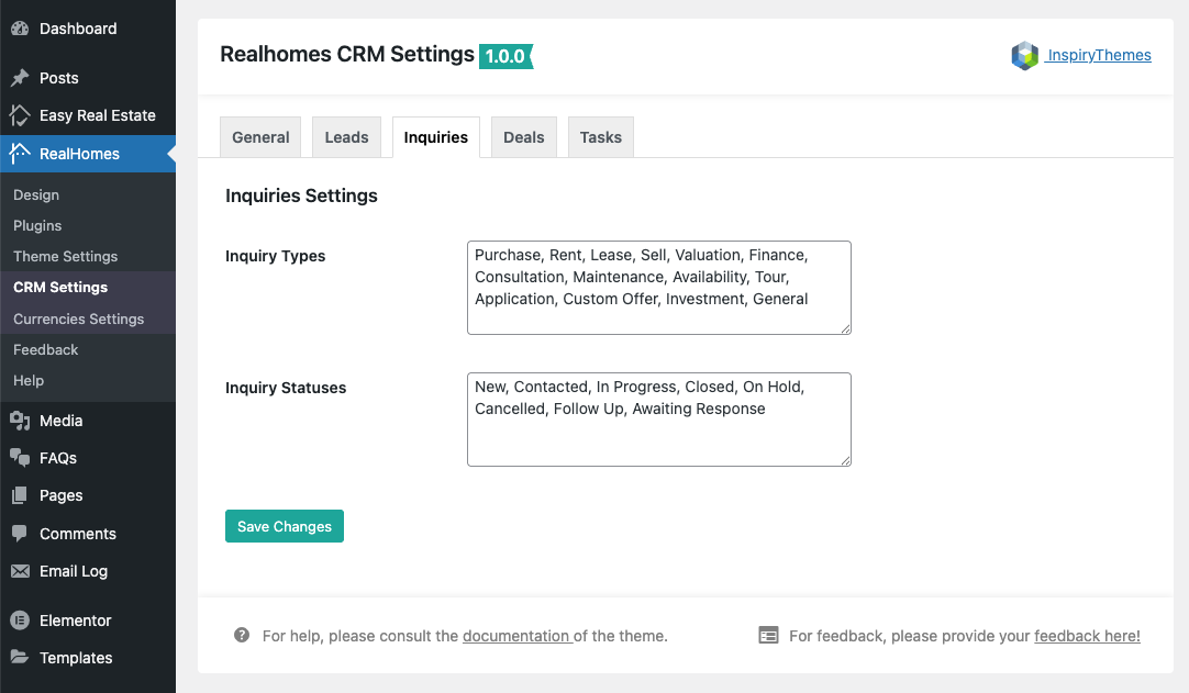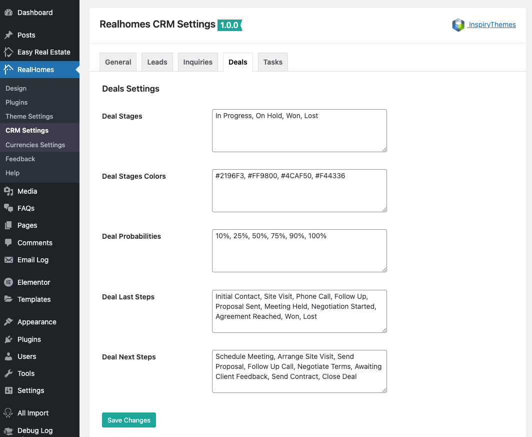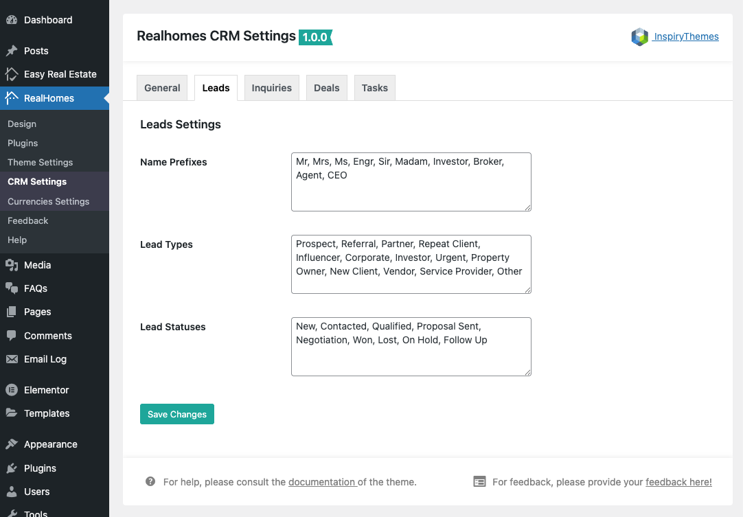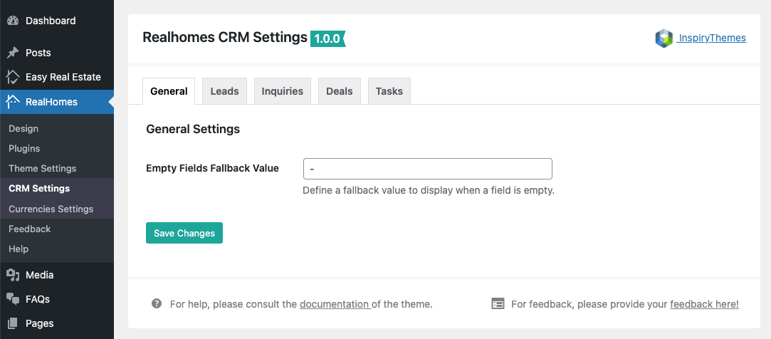 Go to Dashboard → RealHomes → CRM Settings to configure the plugin's core options. The settings are organized into tabs.
