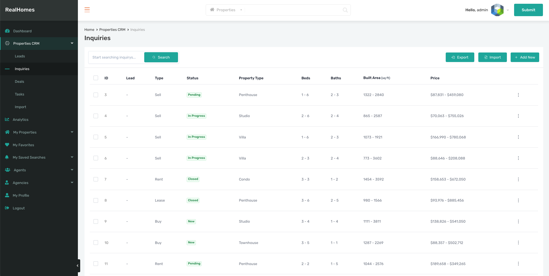 A list of all property-specific inquiries. This table includes ID, Lead, Type, Status, Property Type, Beds/Baths, Area, and Price.