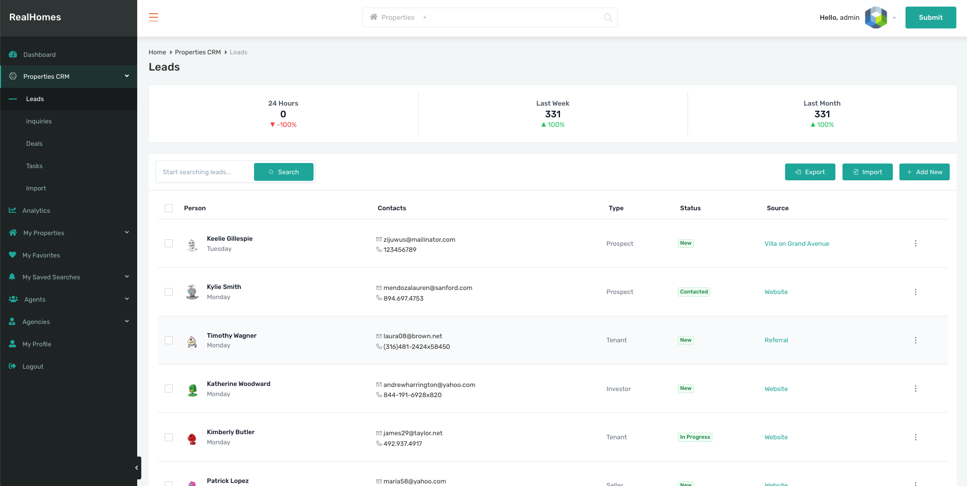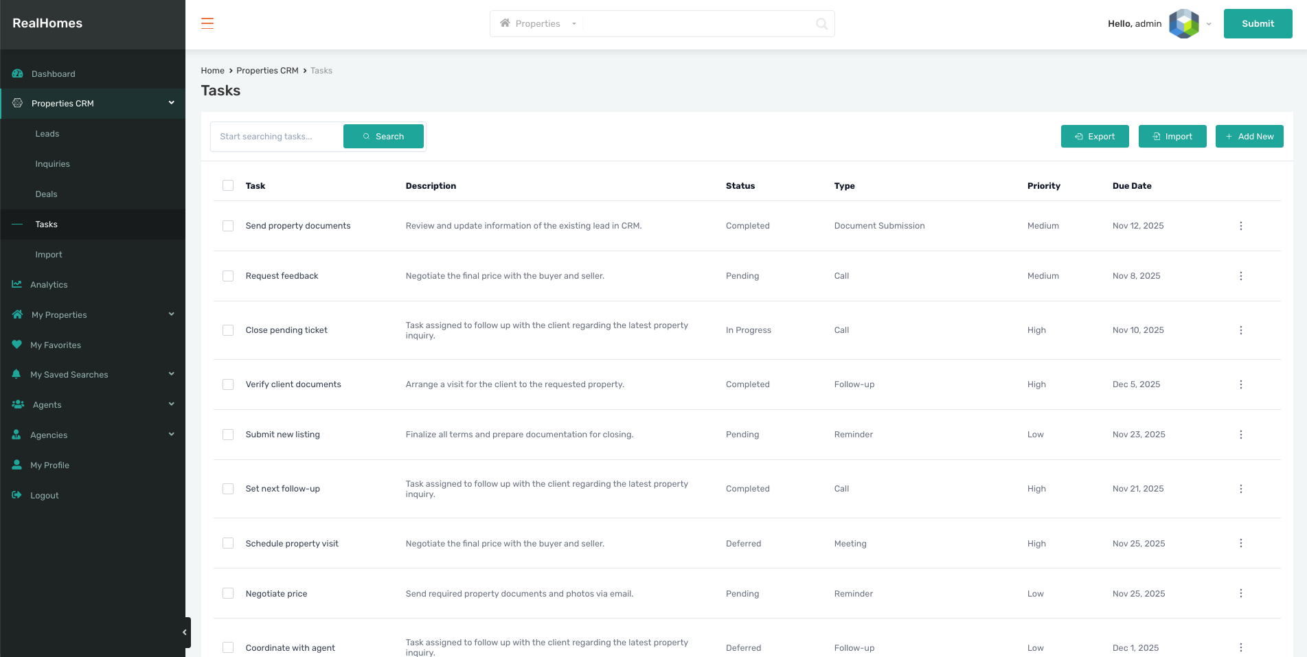 You can also use the + Add New, Import, and Export buttons available on the Leads, Inquiries, Deals, and Tasks pages to manage your data.
