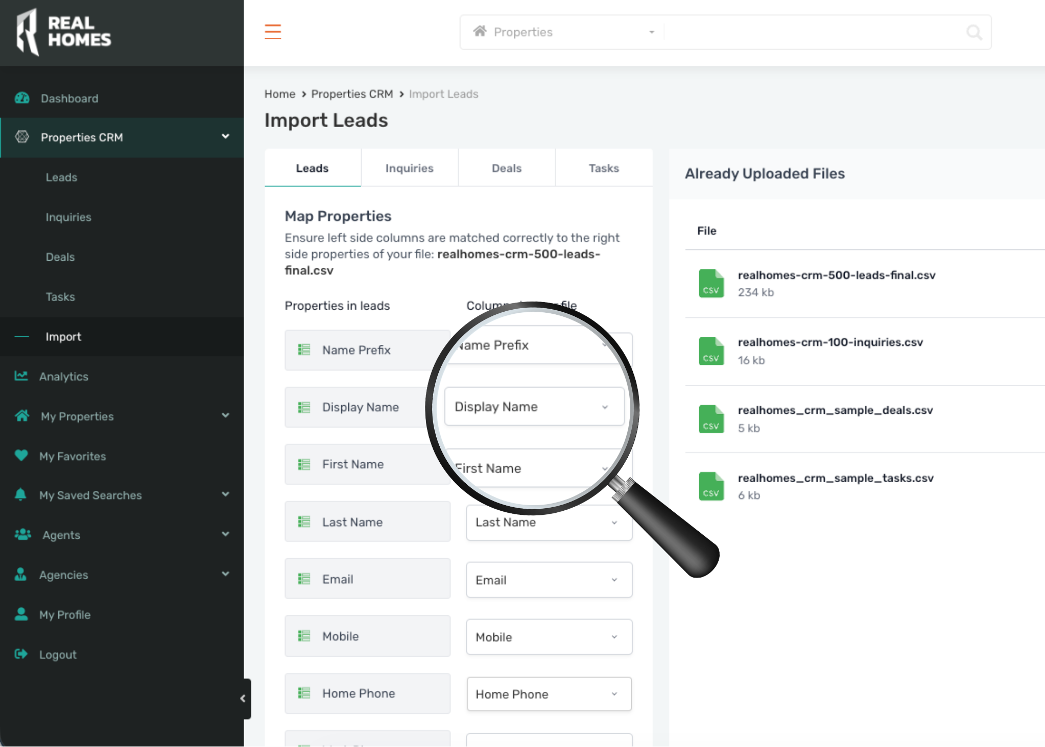 After uploading your CSV, youβll match your CSV columns to RealHomes CRM fields.