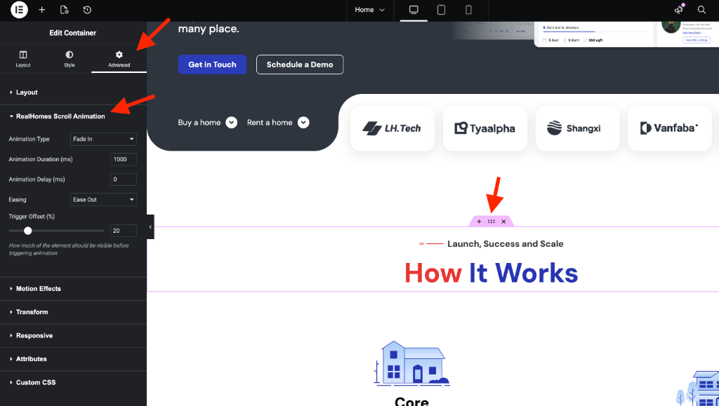 RealHomes introduces a built-in Scroll Animation feature for Elementor Containers, allowing you to add professional reveal effects as users scroll down your website.