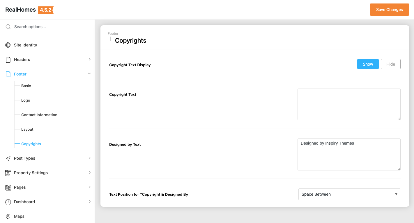 Dashboard ➤ RealHomes ➤ Settings ➤ Footer ➤ Copyrights
