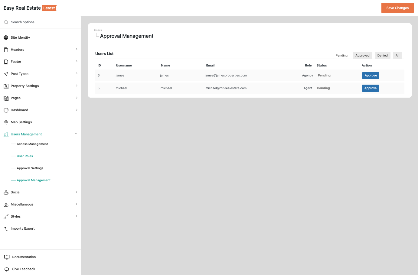 Dashboard → RealHomes → Settings → User Management → Approval Management